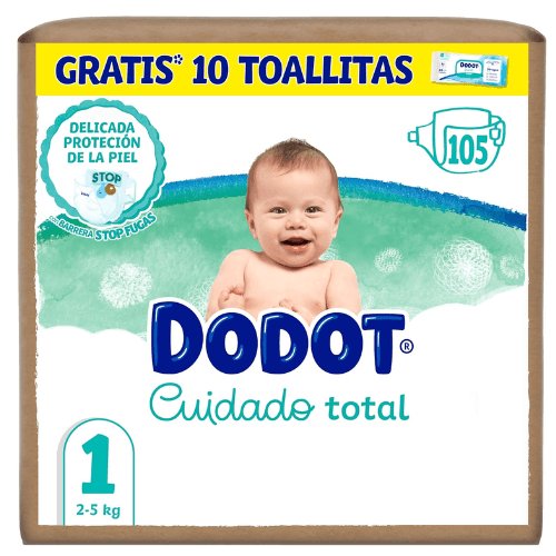 Este pack Dodot Cuidado Total talla 1 ofrece valor. 105 pañales hipoalergénicos sin cloro. Más 10 toallitas. Ahorra hasta 30% vs. compras separadas.