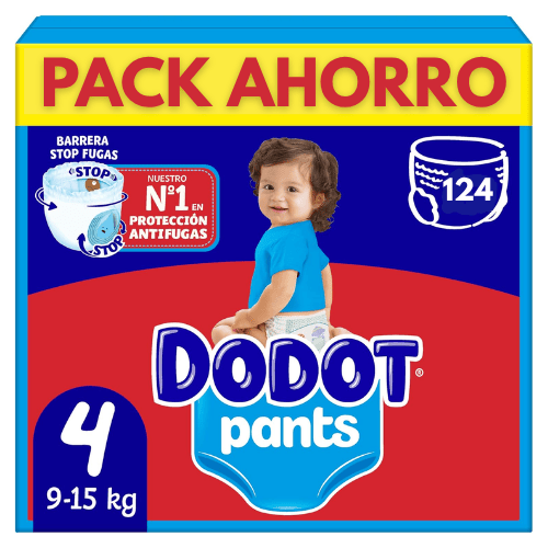 Los pañales braguita Dodot Pants talla 4 en formato pack ahorro de 124 unidades están pensados para bebés de entre 9 y 15 kg que ya tienen una mayor actividad y requieren un sistema de cambio más ágil. Su diseño tipo braguita permite colocarlos de forma rápida, sin necesidad de ajustar adhesivos, lo que facilita el proceso en cualquier situación.