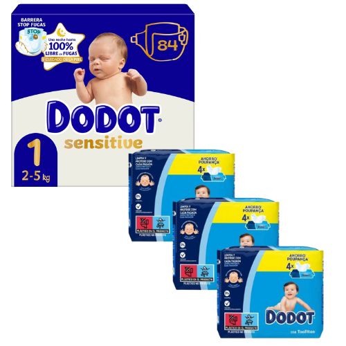 El pack Dodot Sensitive talla 1 (2-5 kg) está pensado especialmente para los recién nacidos, ofreciendo un cuidado integral con la máxima suavidad y protección desde el primer día. Incluye 84 pañales Dodot Sensitive talla 1 con tecnología Stop Fugas y una caja completa de toallitas Dodot Azules (12×52 unidades) para cubrir todas las necesidades de higiene del bebé.