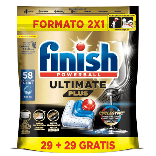 Finish Powerball Ultimate Plus 58 Cápsulas (29 + 29 Gratis) es un detergente para lavavajillas diseñado para ofrecer una limpieza profunda en cada lavado. Su fórmula avanzada All in 1 combina diferentes funciones para eliminar grasa, restos de comida y suciedad incrustada en la vajilla.