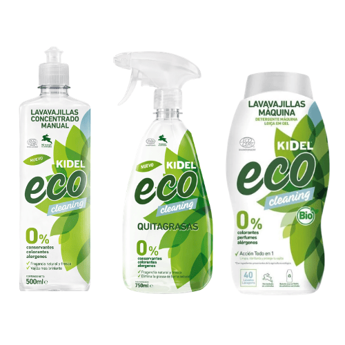 ¿Y si pudieras tener todo lo que necesitas para limpiar tu cocina de forma eficaz, natural y sostenible en un solo pack? Eso es exactamente lo que ofrece el Pack Kidel Eco Cleaning, que reúne tres de sus productos más completos y versátiles: el Quitagrasas Spray, el Lavavajillas Manual Concentrado y el Lavavajillas Máquina en Gel Bio. Una solución integral para mantener la cocina impecable sin comprometer la salud ni el medio ambiente.