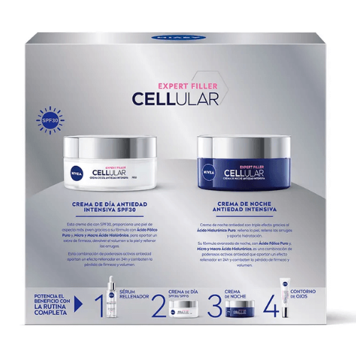 El Estuche NIVEA Cellular Expert Filler Tratamiento Extrafirmeza Día y Noche está diseñado para ofrecer una rutina completa de cuidado facial antiedad. Este estuche combina dos productos complementarios, una crema de día con FP30 y una crema de noche, pensados para actuar de forma continuada sobre la piel durante las 24 horas del día.