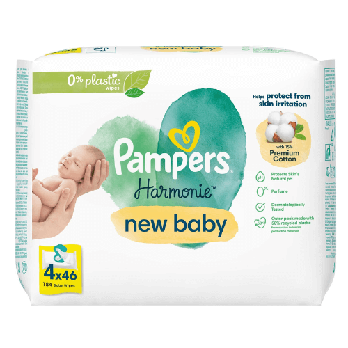 Comprar Pampers Harmonie New Baby Toallitas Pack 4 x 46 es una opción adecuada para quienes buscan toallitas para recién nacido con algodón premium, 0% plástico en la toallita y fórmula suave para piel sensible.